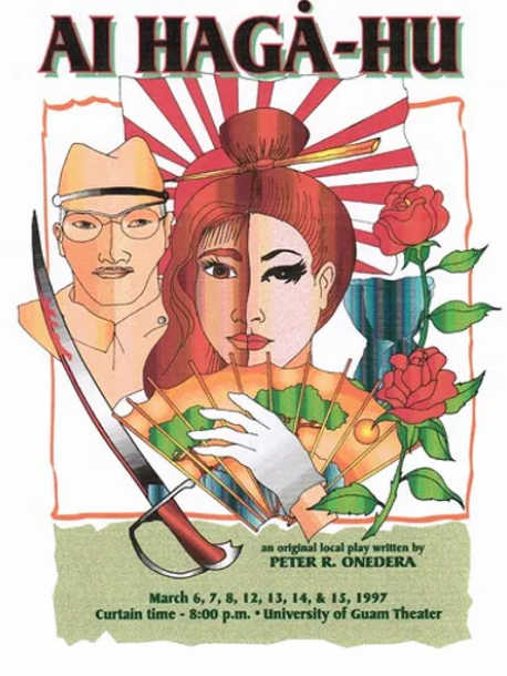 (AN ANIMATED IMAGE POSTER OF PETER ONEDERA’S PLAY CALLED, “AL HAGÅ-HU.” THE PLAY WAS BASED OFF OF REAL-LIFE EXPERIENCES OF A CHAMORU ‘COMFORT WOMAN.’ ONEDERA IS A STORYTELLER AND ADVOCATE FOR THE PRESERVATION OF THE CHAMORU LANGUAGE AND HISTORY. [ID: THERE IS A RISING SUN FLAG BEHIND THE WOMAN. ON THE RIGHT, HER HAIR IS HELD UP WHEREAS THE LEFT-SIDE IS LET DOWN. SHE IS HOLDING AN ORANGE FAN WITH ILLUSTRATIONS OF TREES AND A SUN. A JAPANESE SOLDIER IS STARING AT HER ON HER LEFT. THERE ARE TWO RED ROSES AND A SWORD AS WELL.])