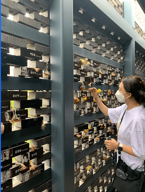 IMAGE OF YOO YEEUN WEARING A WHITE T-SHIRT AND PLACING A YELLOW FLOWER ONTO THE WALL OF KOREAN ‘COMFORT WOMEN’ WHO HAVE PASSED AWAY.)