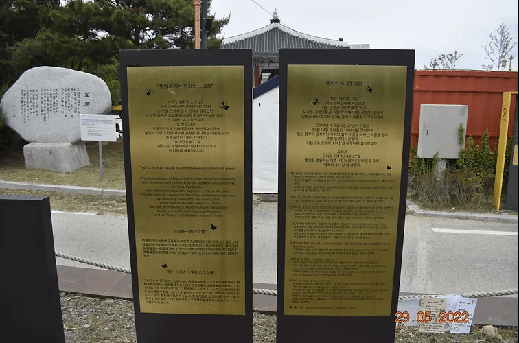 (“‘THE STATUE OF PEACE TOWARD THE REUNIFICATION OF KOREA’” — ‘COMFORT WOMEN’ OF TONGIL CITY. [ID: GOLDEN FRAMES NEXT TO THE STATUE OF PEACE IN PAJU CITY. THERE ARE KOREAN, ENGLISH, MANDARIN, AND JAPANESE TEXT/TRANSLATIONS.]