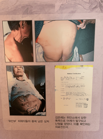 (THE WAR AND WOMEN’S HUMAN RIGHTS MUSEUM – 김은례 (KIM EUN-RYE)’S MEDICAL CERTIFICATION. [ID: THIS SHOWS THREE IMAGES OF PHYSICAL WOUNDS AND SCARS ALL AROUND HER STOMACH, BACK, AND SHOULDERS–FROM JAPANESE SOLDIERS.])