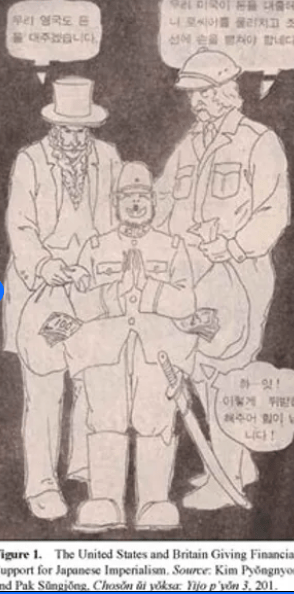(AN ARCHIVED, KOREAN ILLUSTRATION REGARDING THE ‘US’ AND GREAT BRITAIN OFFERING FINANCIAL SUPPORT AND BAGS OF MONEY FOR JAPANESE COLONIZATION AND IMPERIALISM OF KOREA.)