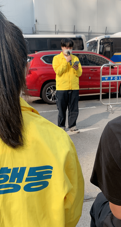 (PHOTO OF LEE SU-MIN GIVING A SPEECH ON THE NEED FOR TRUE, REVOLUTIONARY JUSTICE AND THEIR OWN EXPERIENCE WITH BECOMING AN ACTIVE ORGANIZER. “I CANNOT DREAM (OF JOBS OR COMFORTABILITY) BECAUSE MY ANGER TO ENACT ACTION IS BIGGER THAN ALL ELSE.”)