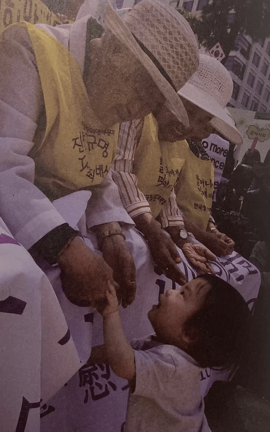 (THE 1020TH WEDNESDAY PROTEST ON MAY 2, 2012. A YOUNG, SMILING TODDLER IS PHOTOGRAPHED [BY CONSENT] REACHING OUT TO THE ‘COMFORT WOMEN.’ OUR HALMONIES’ HOPE IN THE YOUTH IS WHAT MUST KEEP US GOING. CREDIT: THE KOREAN COUNCIL)