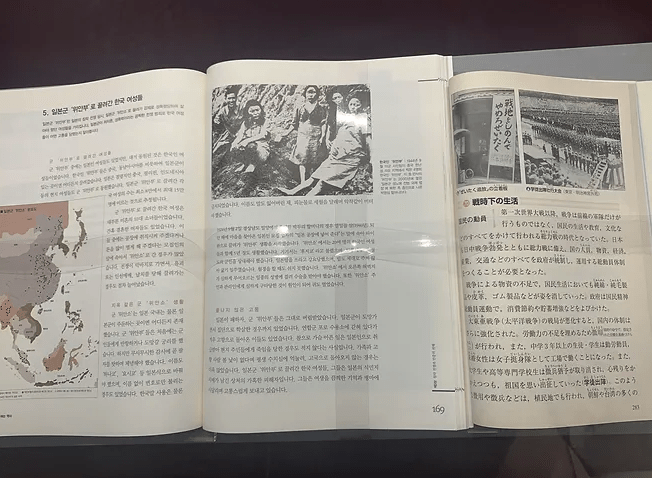 (TWO TEXTBOOKS. DIFFERENT HISTORIES. THE LEFT TEXTBOOK IS TAUGHT IN KOREA WHEREAS THE RIGHT IN JAPAN. THERE IS CLEAR CENSORSHIP IN THE JAPANESE TEXTBOOK’S HISTORY AND TRAUMA OF ‘COMFORT WOMEN.’)
