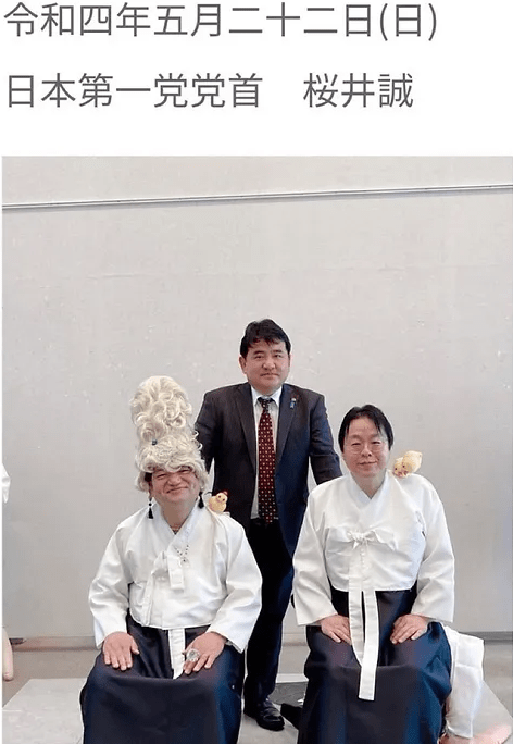(JAPANESE REVISIONIST, NATIONALIST GROUP ‘DRESSED UP’ AS KOREAN ‘COMFORT WOMEN.’ THEY ARE GRINNING AT THE CAMERA, ATTEMPTING TO IMITATE THE STATUE OF PEACE.)