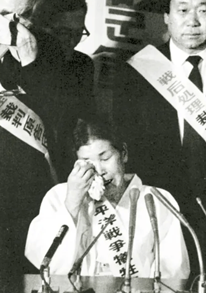 (PHOTO OF 김학순 (KIM HAK-SOON) FACING THE PUBLIC WHILE TESTIFYING HER ACCOUNTS OF HORROR. PHOTOGRAPHER: UNKNOWN