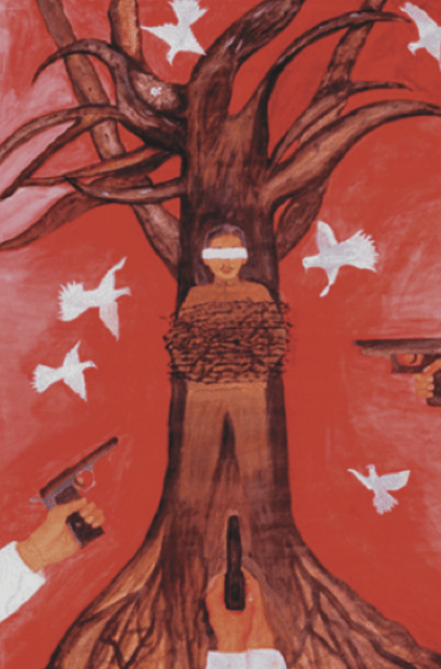 [ID: A BROWN TREE WITH BARE BRANCHES EXTENDING THE PAINTING. THERE ARE WHITE DOVES SOARING ACROSS THE RED SKY/BACKGROUND. THERE ARE HANDS AIMING GUNS AT A JAPANESE SOLDIER WHOSE EYES ARE COVERED WITH A WHITE SHEET AND IS TIED TO THE TREE.])